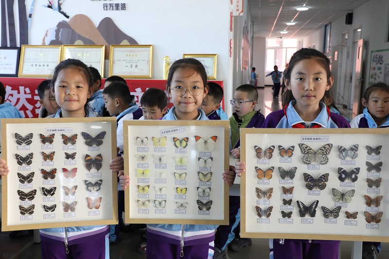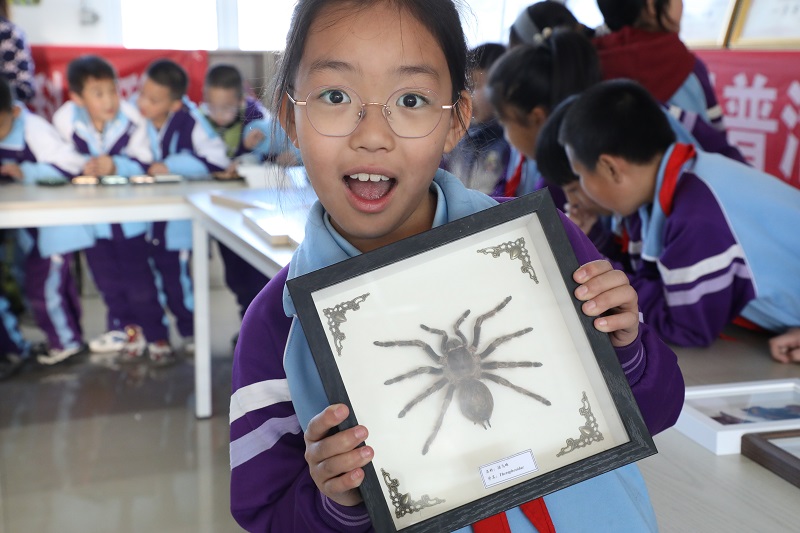 活动现场设置昆虫标本展示区,同学们近距离观察各类标本,并动手参与标本制作实践。现场互动热烈、趣味盎然,孩子们眼神专注、踊跃提问,洋溢着对科学知识的浓厚兴趣与强烈求知欲。